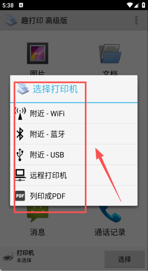2、进入选择打印机界面,挑附近WiFi蓝牙或USB连接目标打印机。
