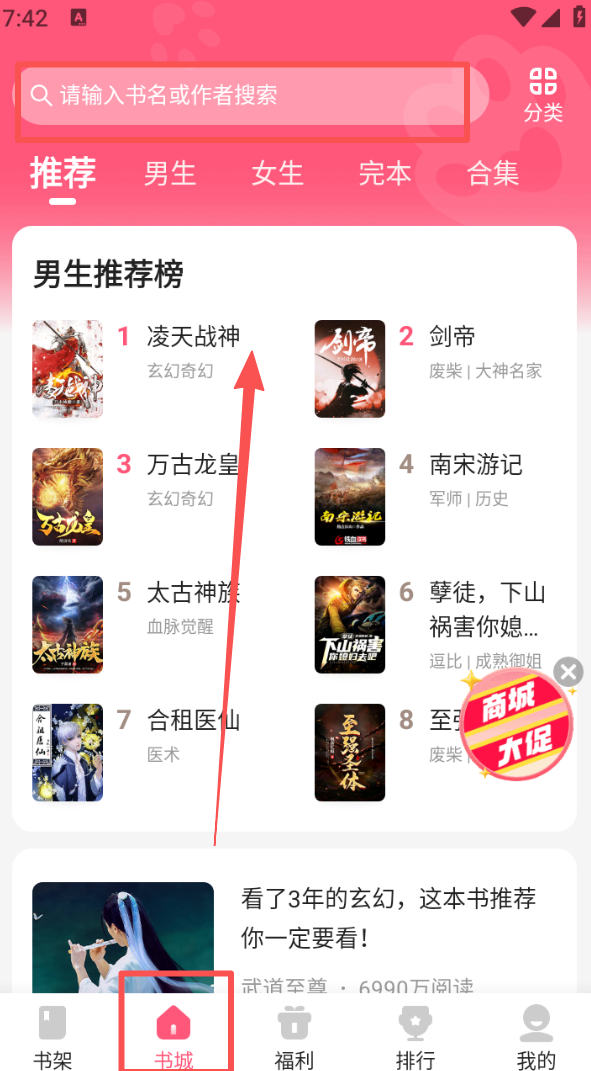 1、在 “书城” 页面,点击顶部搜索框,可输入书名或作者查找小说。
