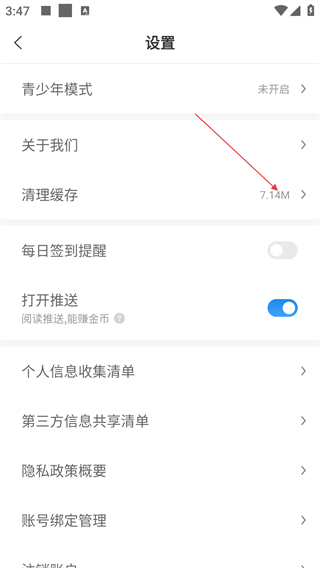 3、在设置页面,点击【清理缓存-7.14M】,可清理软件缓存,优化软件运行速度。