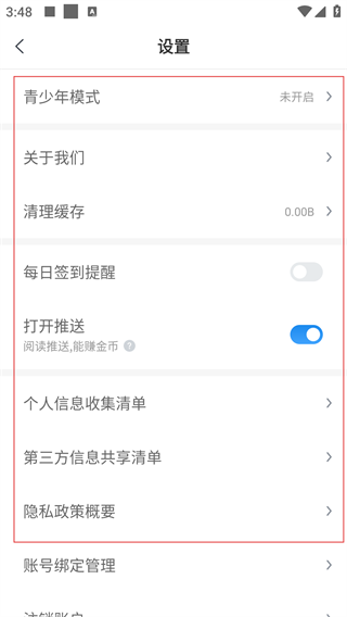 2、在个人中心页面,点击【设置】,进入设置页面,可调整青少年模式、缓存清理等功能选项。
