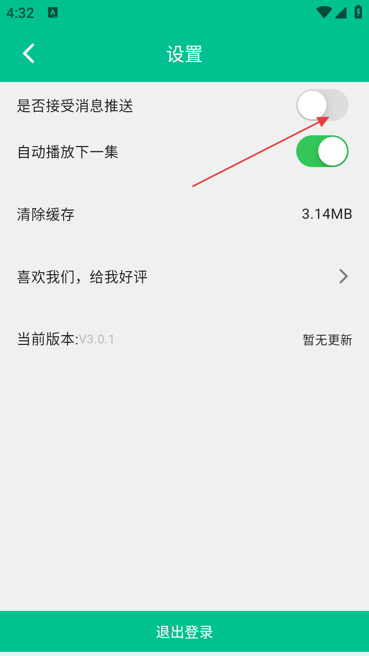 3、在设置页面,找到【是否接受消息推送】选项,点击其右侧的开关按钮。