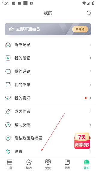 2、在个人中心,可查看【听书记录】【我的笔记】等信息,也可进入【设置】页面进行相关功能设置。