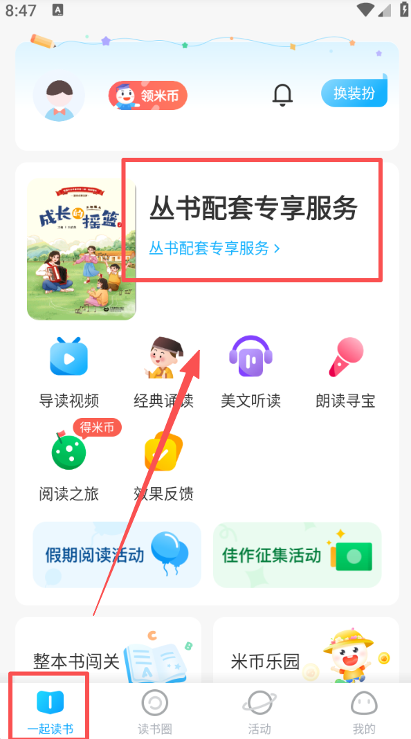 1、在 “一起读书” 页面,可找到 “丛书配套专享服务” 入口,点击进入查看相关服务内容。
