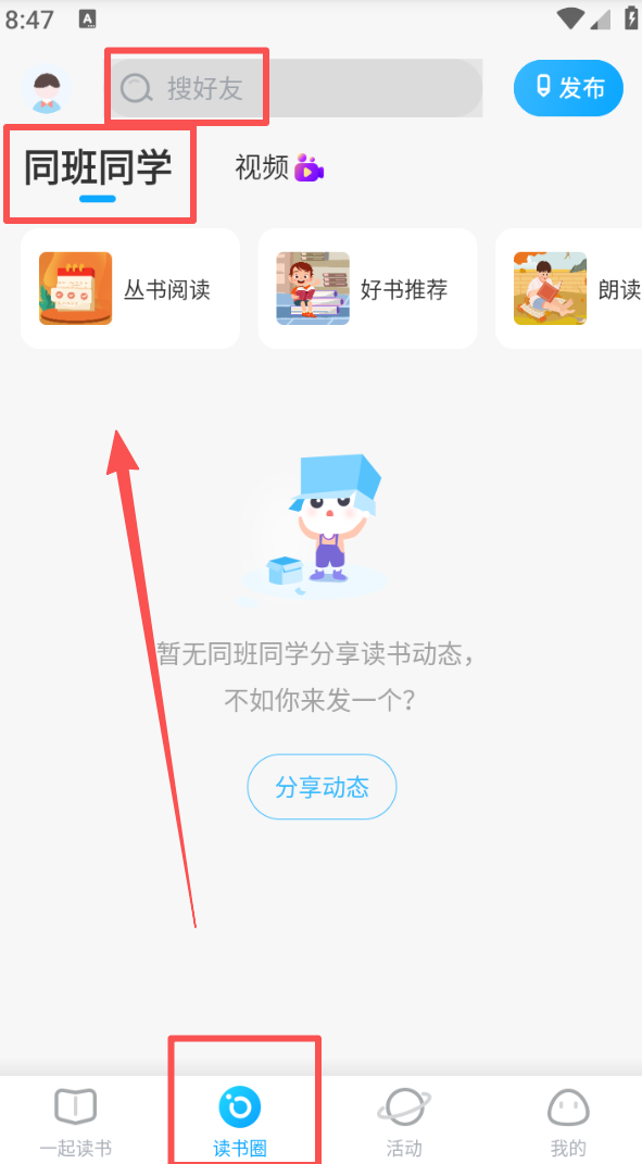 2、切换到 “读书圈” 板块,在 “同班同学” 分类下,能看到丛书阅读、好书推荐等功能选项。