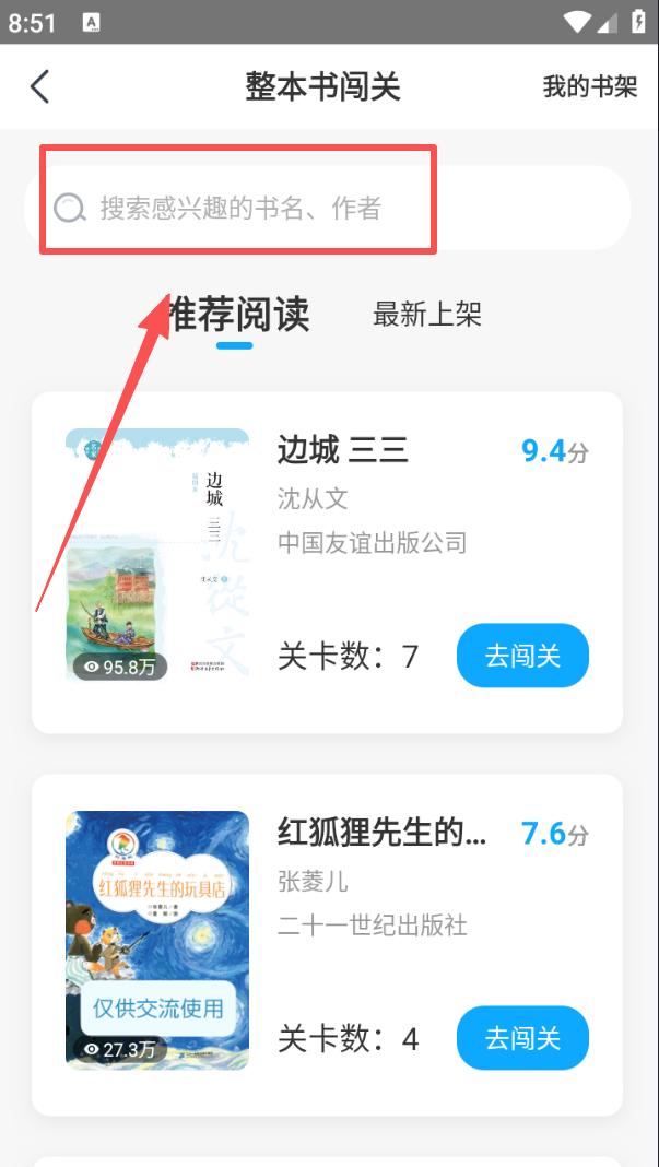 3、进入 “整本书闯关” 页面,通过搜索框可查找感兴趣的书名或作者,也可浏览推荐阅读的书籍。