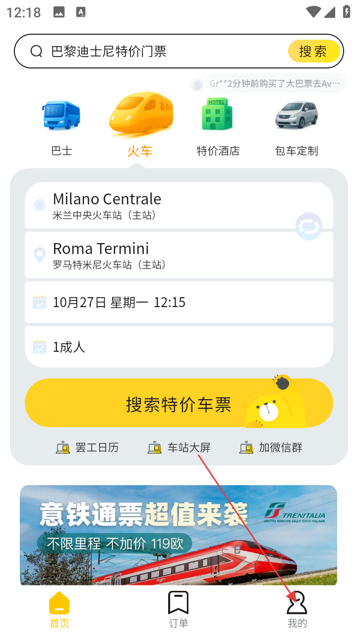 1、首页可搜【巴黎迪士尼特价门票】,选【火车】功能设米兰到罗马行程,点击【我的】进个人页。