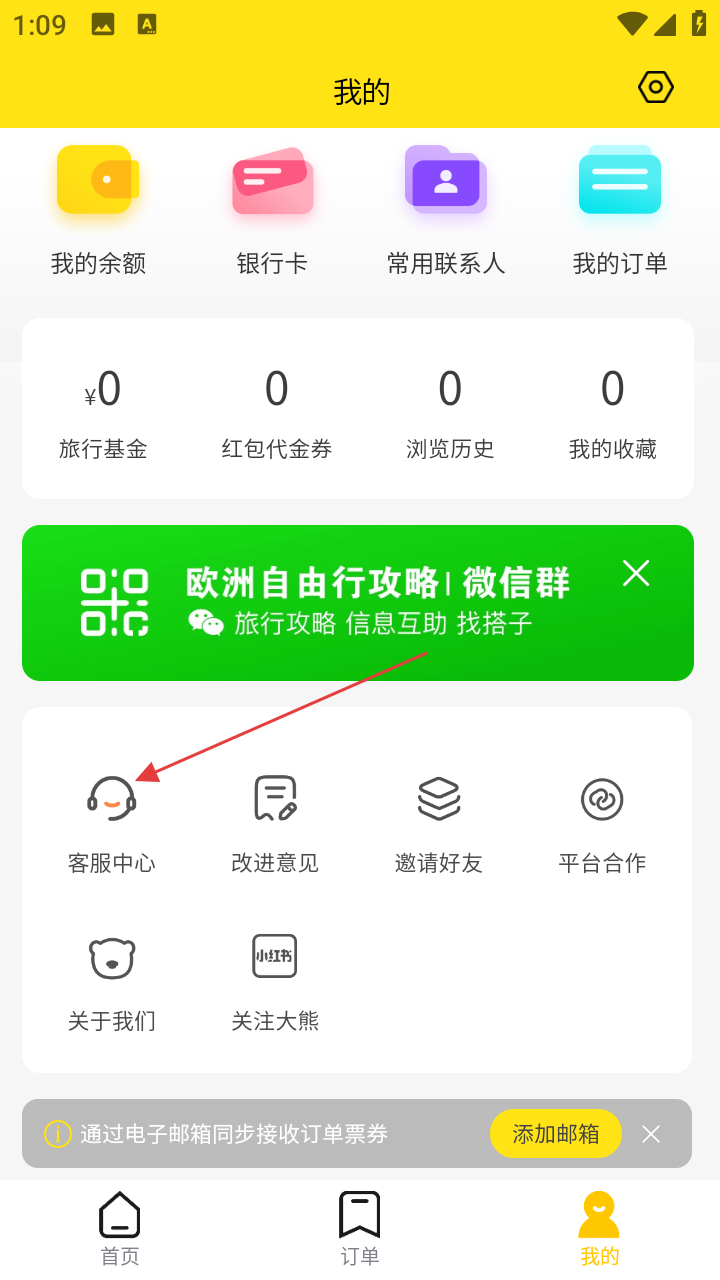 2、在【我的】页面,点击【客服中心】,可进入客服界面获取服务。