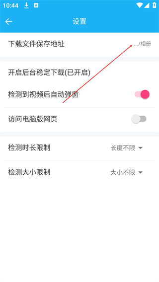 4、在应用设置页,点击【下载文件保存地址】选项,即可修改文件的存储路径。