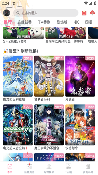 1、进入软件首页,可浏览《3年Z班银八老师》《电锯人》等推荐动漫,点击底部【新番周刊】。