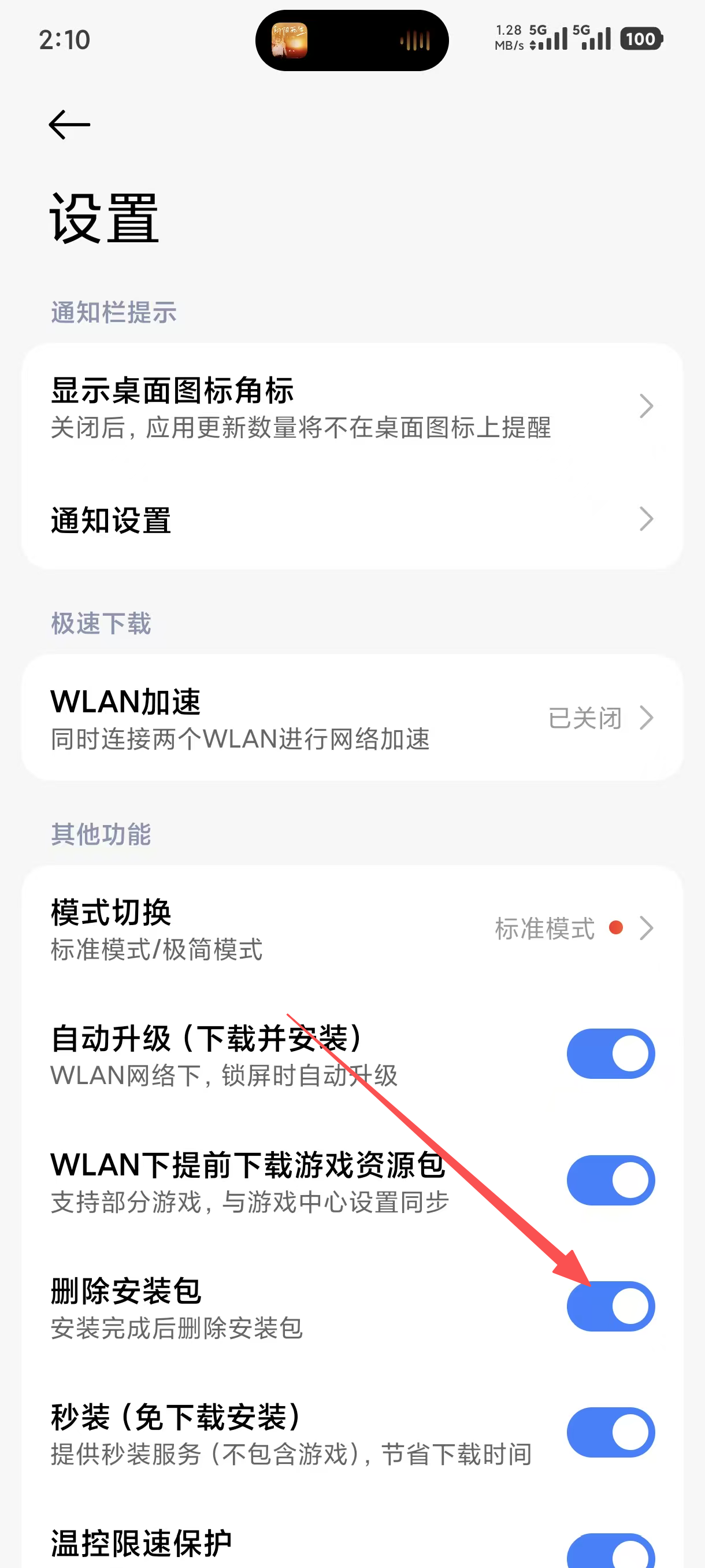 4、操作后可查看设置界面变化,确认【删除安装包】功能状态,按需管理安装包以节省手机存储空间。