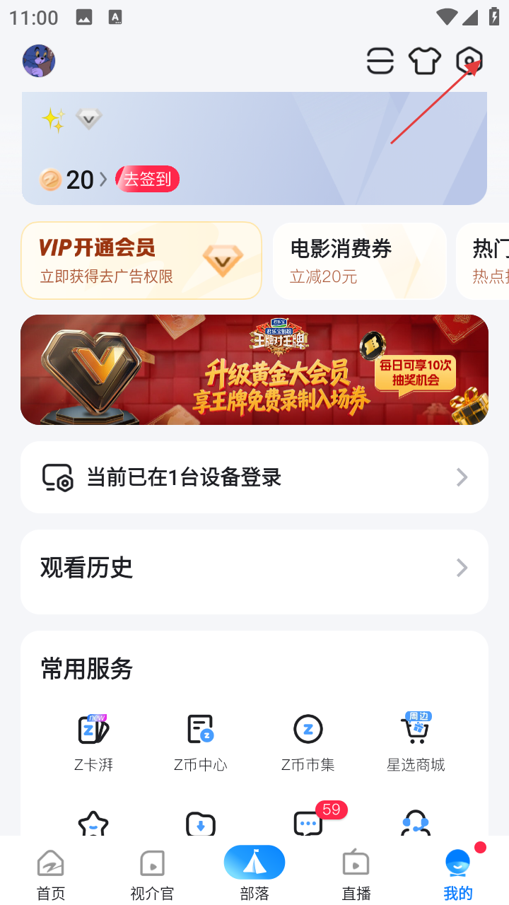 2、进入个人中心页面后,点击右上角设置图标,进入设置界面。