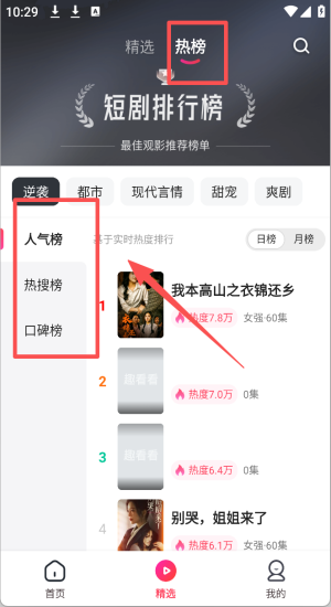 1、点击“精选”标签,选择“热榜”查看热门视频。