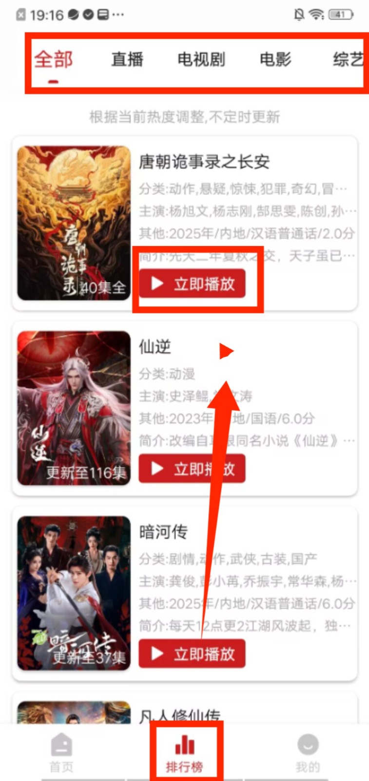 2、切换到排行榜页面,通过 “全部”“电视剧” 等分类筛选,选中目标内容后点击 “立即播放” 开始观看。