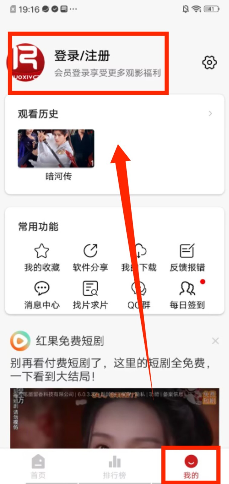 4、进入 “我的” 页面,点击 “登录 / 注册” 完成账号操作后,可查看观看历史、管理已缓存的内容。