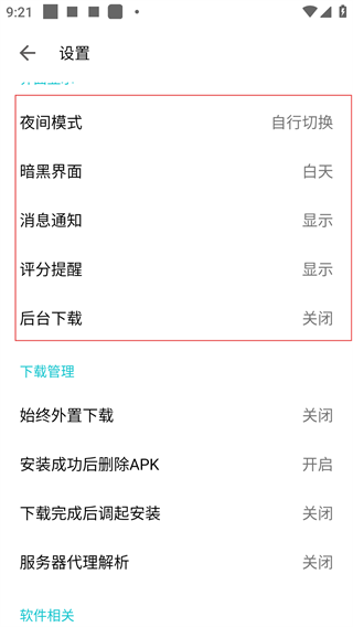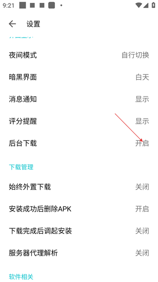 3、在设置页面,可配置界面显示、消息通知、下载管理等功能,当前“后台下载”处于开启状态,可按需调整。