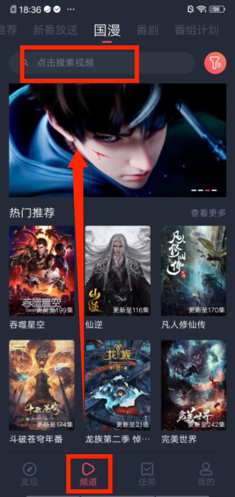 1、进入 “频道” 页面,在 “国漫” 分类下,可通过顶部搜索框查找目标内容,也能浏览热门推荐的作品。