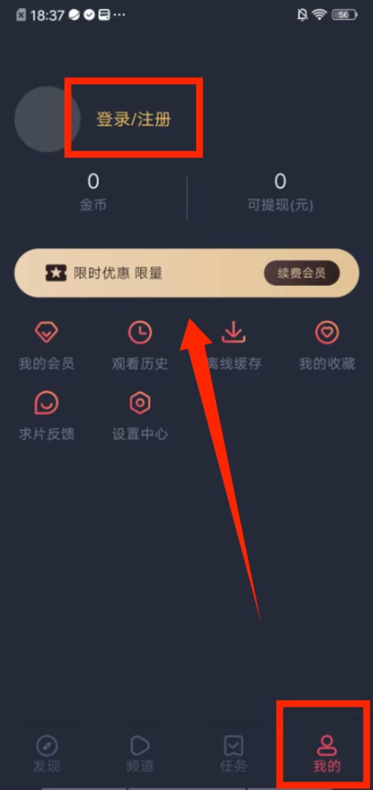 4、切换到 “我的” 页面,点击 “登录 / 注册” 选项,完成账号操作后可使用会员、收藏等个人功能。