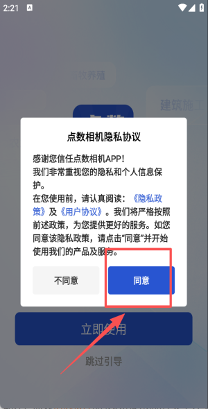 1、打开应用阅读隐私协议,点击“同意”进入首页,再点“跳过引导”直入主界面。