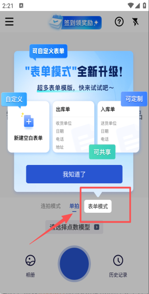 2、点“签到领奖励+”后选“表单模式”,新建出库单模板并勾选共享,即可保存。