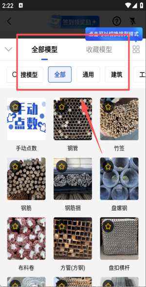 3、在“选择点数模型”页搜“钢筋”,收藏常用规格,返回首页点“相册”导入图。