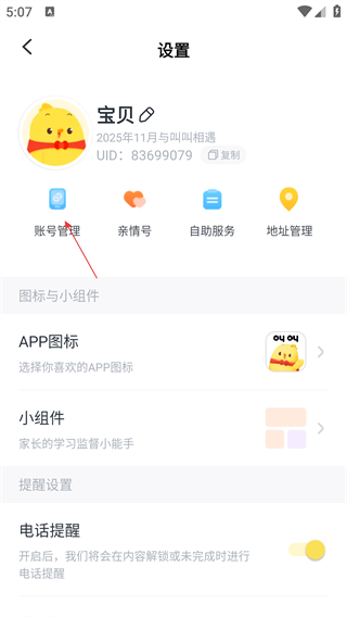 3、在叫叫APP设置界面,点击【账号管理】可进行手机号、微信号等账号相关管理,还能设置亲情号、自助服务等。