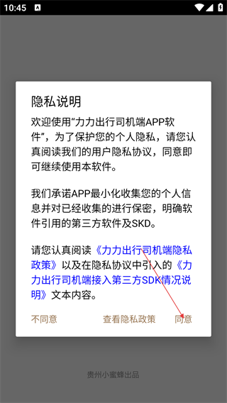 1、首次打开APP,阅读《隐私说明》后点击【同意】,完成隐私协议授权,进入登录界面。