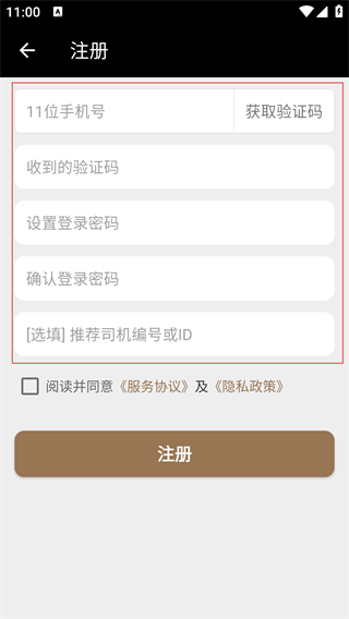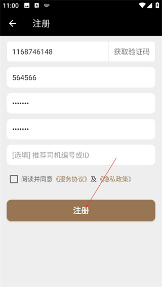 3、在注册页面,依次填写11位手机号、获取并输入验证码,设置登录密码并再次确认,选填推荐司机编号或ID。