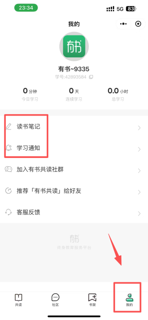 4、在“我的”页面,点击“读书笔记”查看自己的笔记记录。
