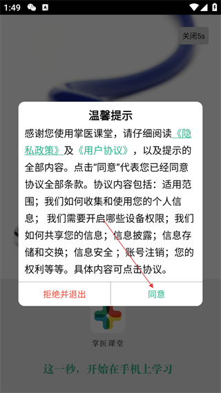 1、首次打开App时,在“温馨提示”弹窗中点击【同意】按钮,进入登录引导页面。