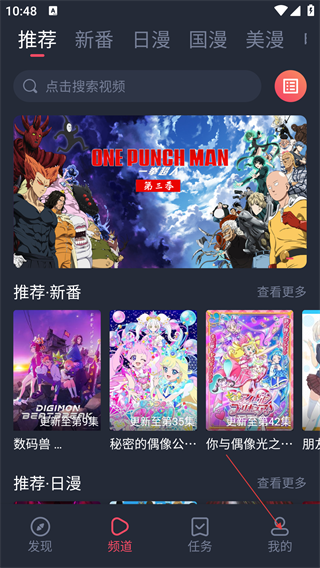 1、进入软件后,可通过顶部【推荐-新番-日漫-国漫-美漫】分类筛选内容,点击底部【我的】进入我的界面。