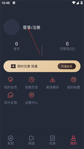 2、切换至【我的】页面,可通过【登录/注册】入口绑定账号,还能使用【我的会员】【离线缓存】等功能。