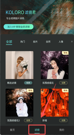 3、进入滤镜页点击加入VIP解锁全部胶片人像自然精选滤镜包。