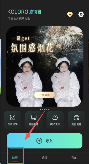 2、点击导入选择图片或视频使用氛围感烟花滤镜一键添加效果。