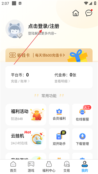 1、在游戏平台首页,点击右下角【我的】,进入个人界面。