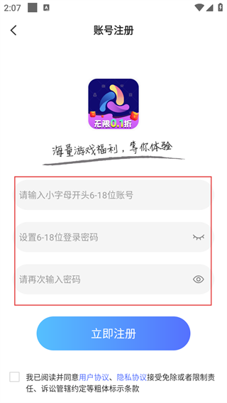4、在账号注册界面,输入账号、设置登录密码并再次确认密码,勾选已阅读并同意协议后,点击【立即注册】按钮,即可完成账号注册。