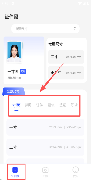 1、打开奇趣相机,在证件照首页搜索框输入“中国护照”,点选25×35mm尺寸。