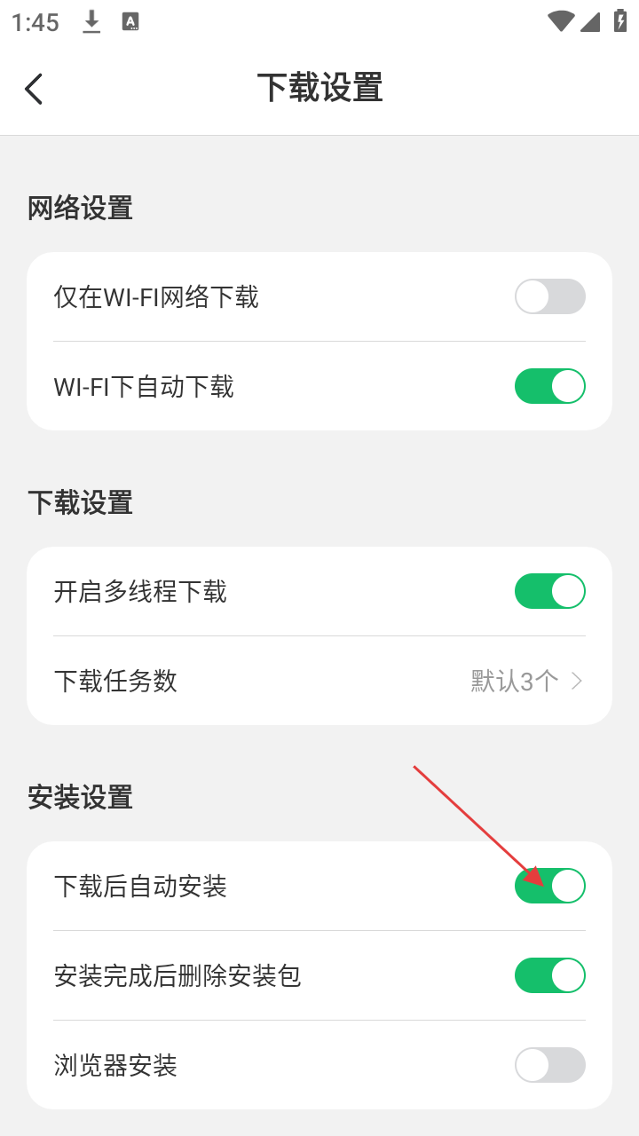 4、在下载设置页面,可根据需求开启或关闭“下载后自动安装”等选项,以调整下载和安装的相关设置。