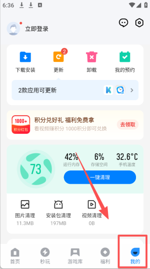 4、在“我的”页面,点击“一键清理”优化手机存储空间。