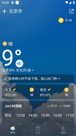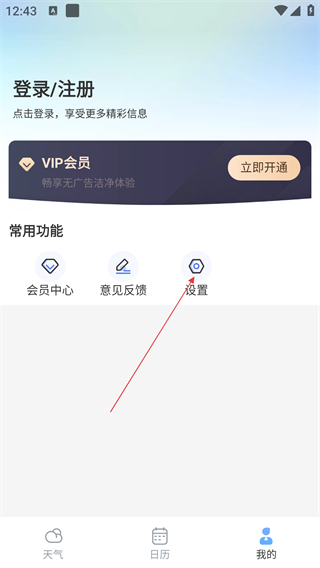 1、在天气主界面,点击底部【我的】,进入个人中心页面,查看功能选项。