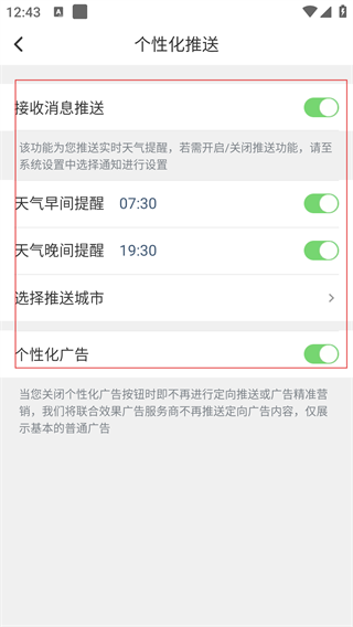 4、点击【选择推送城市】,可指定接收天气提醒的城市,调整个性化广告开关以控制广告推送类型。