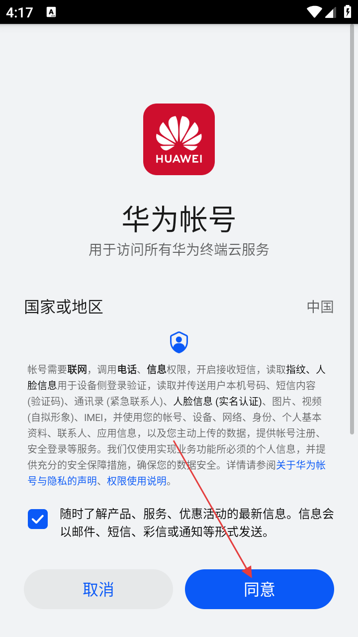 1、打开华为帐号注册流程后,首先会看到权限说明页面,点击【同意】进入下一步。