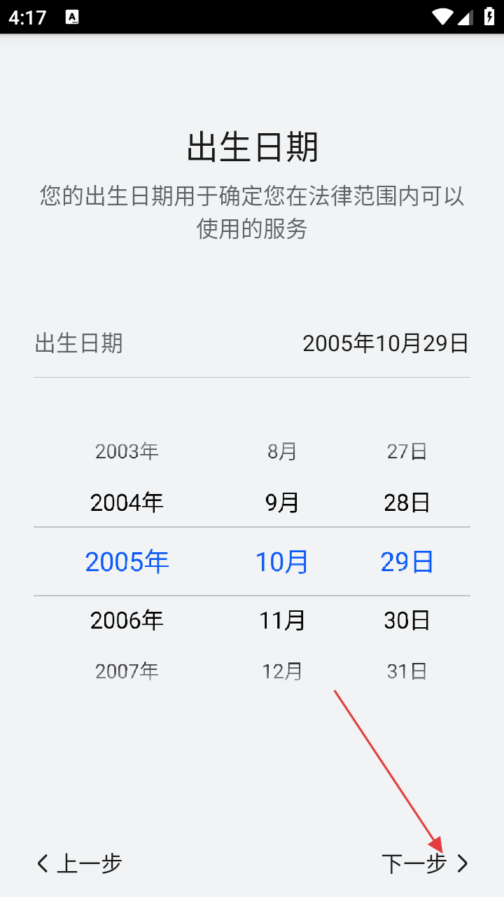 2、在出生日期选择页面,选择自己的出生日期后,点击【下一步】。
