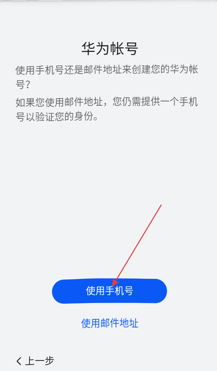 3、在华为帐号创建方式选择页面,点击【使用手机号】进入手机号输入页面。