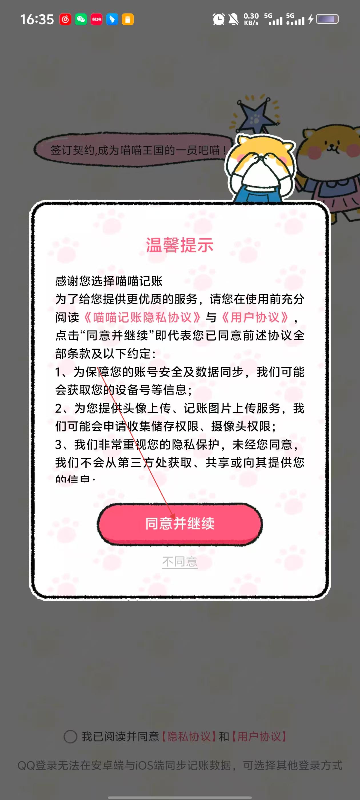 1、使用【喵喵记账】前,需阅读并同意【隐私协议】与【用户协议】,点击【同意并继续】方可进入下一步。