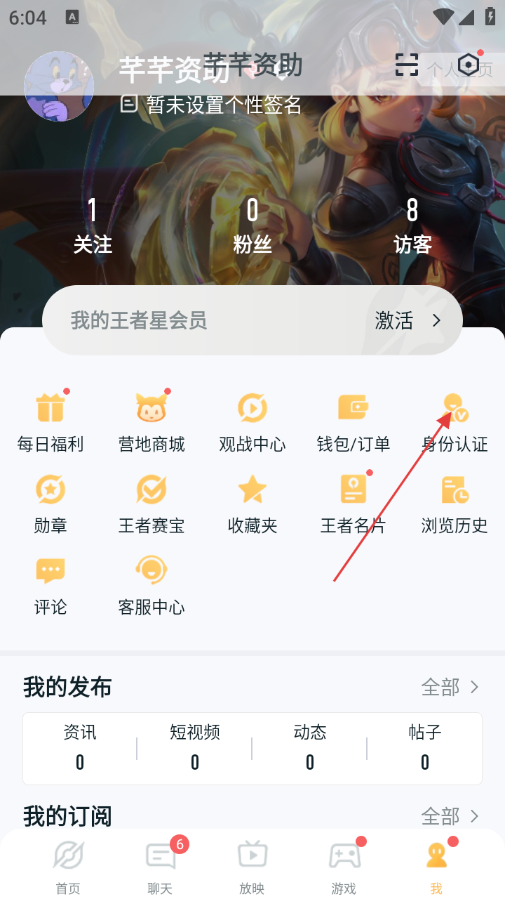 2、在个人页面,找到【身份认证】选项并点击,进入王者营地认证页面。