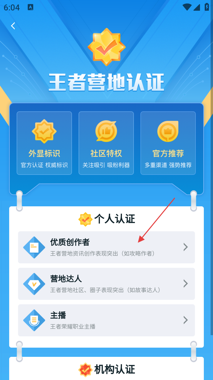 3、在王者营地认证页面,选择【优质创作者】认证选项,进入优质创作者认证条件页面。