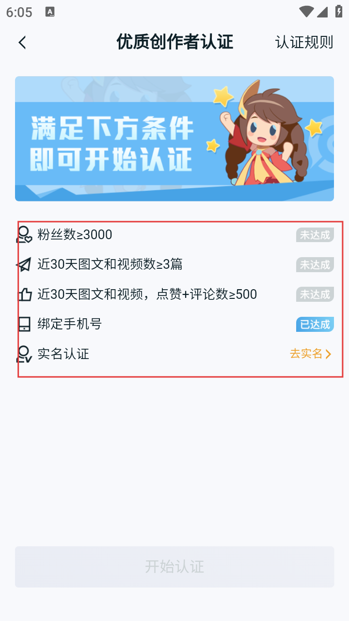4、在优质创作者认证页面,查看粉丝数、内容数量等认证条件,若满足即可点击【开始认证】。