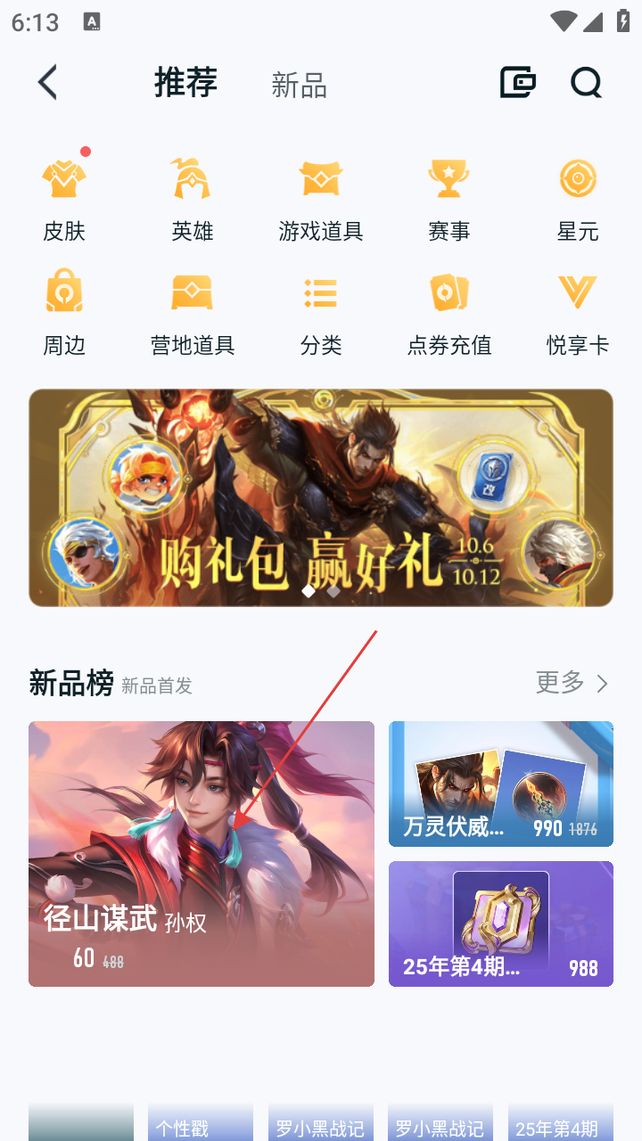 3、在营地商城页面,可看到推荐商品,找到想要购买的商品,如【径山谋武-孙权】皮肤,点击进入商品详情页。