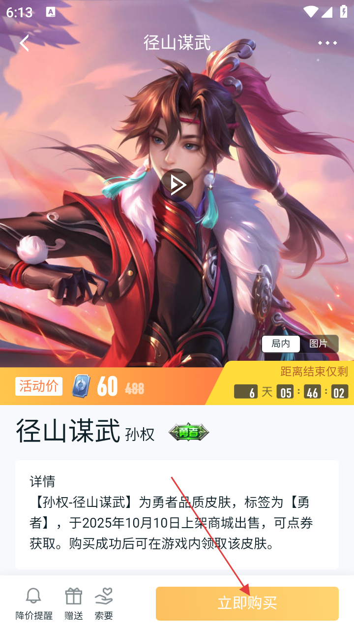4、在商品详情页,查看皮肤详情,若确定购买,点击【立即购买】,即可进行购买操作。