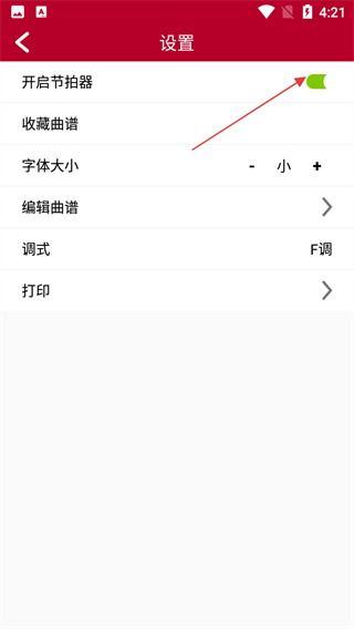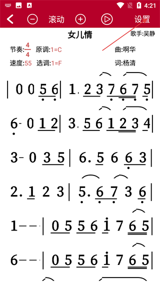 3、点击曲谱进入演奏页面,可查看节奏、原调、速度、选调等信息,点击【设置】可进入设置界面。